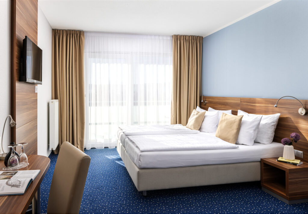 Komfortabel eingerichtete Zimmer mit Dusche/WC, Föhn, Minibar, Kofferablage, Safe, Sat-TV, Telefon und Südbalkon.