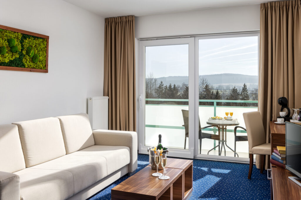 Komfortabel eingerichtete Suite mit Schlaf-/ Wohnraum, Schminktisch, Badewanne/WC, Föhn, Schlafcouch, Minibar, Wasserkocher mit Teeauswahl, Kapselkaffeemaschine, Safe, 2x Sat-TV, Telefon und Südbalkon